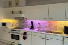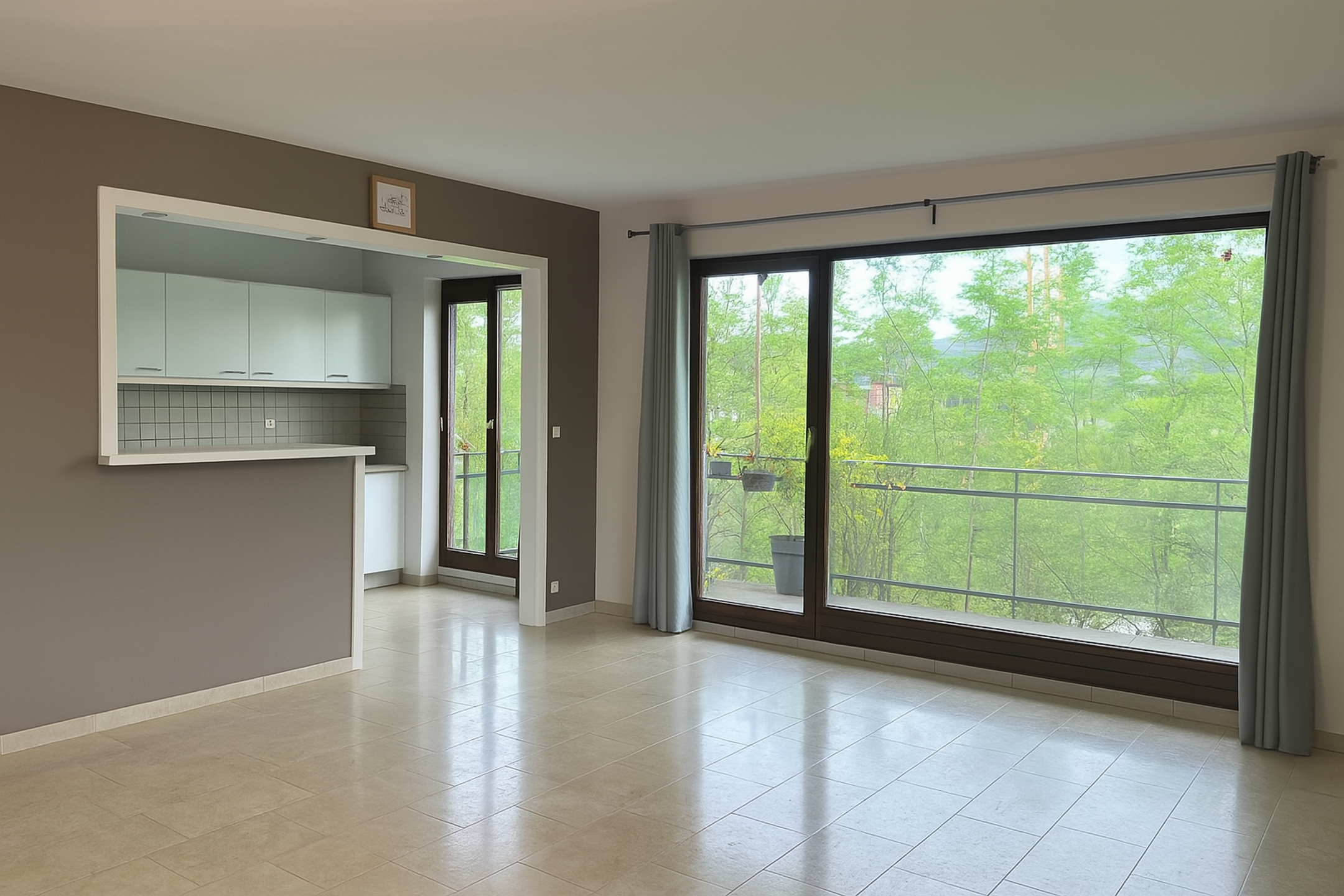 Living avec cuisine américaine équipée (42m²), meubles, évier, taques vitro, hotte, four, carrelages, accès terrasse