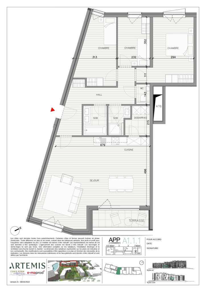 DECOUVREZ sur rdv ou lors de nos portes ouvertes NOTRE NOUVEL APPARTEMENT TEMOIN, rue Julie Dessy 6 à 5100 Jambes Appart. 3 Ch. au 1er étage 117 m² avec terrasse PEB A - Situé au sud de Namur, de l’autre côté de la Meuse, Jambes est le parfait point de chute des nouveaux habitants de la capitale wallonne. Le quartier est facilement accessible, via des nationales reliant en quelques minutes l’E411 et l’E42, et parfaitement desservi par les transports en commun. Artemis s’élève au cœur d’un quartier paisible composé d’immeubles résidentiels et bordé de nombreux espaces verts. Le bâtiment de 59 appartements, à l’architecture sobre et épurée, s’érige au bord de l’étang du Petit-Ry. Point de départ de promenades, les berges de l’étang sont un lieu de rencontre et d’échange idéal pour les habitants du quartier. Il sera aussi un lieu de vie adapté aux familles souhaitant rester proche de Namur, de sa citadelle historique, ses centres de loisirs et ses bonnes adresses. Le rez-de-chaussée et les trois premiers étages se composent chacun de douze appartements aux profils variés: d’une à trois chambres et tous disposant d’au moins une terrasse ou balcon. Une typologie mixte qui offre une belle diversité du côté des occupants: du 1 chambre de 68m2 au vaste 3 chambres de 140m2, en passant par de confortables 2 chambres de 90m2. En retrait le quatrième et le cinquième étage proposent de beaux volumes et de grandes terrasses. Plus d'informations au 010/23.87.00