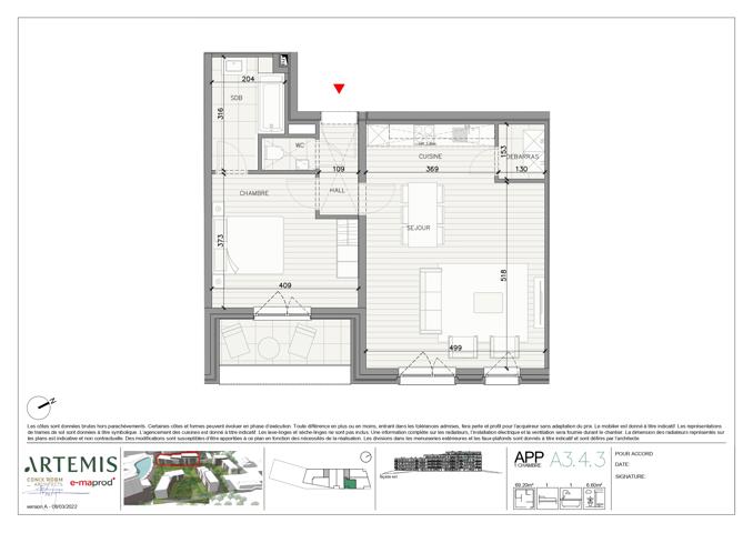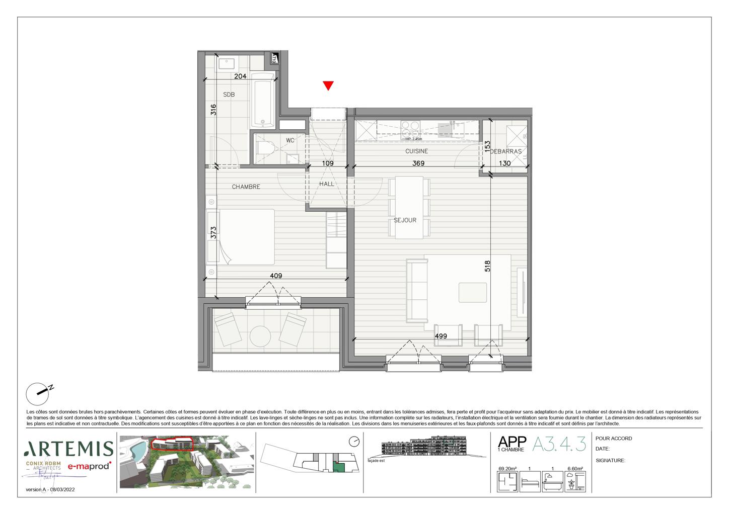 Bel appartement de 69m² - 1 Ch. + terrasse au 4ème étage - PEB A Situé au sud de Namur, de l’autre côté de la Meuse, Jambes est le parfait point de chute des nouveaux habitants de la capitale wallonne. Le quartier est facilement accessible, via des nationales reliant en quelques minutes l’E411 et l’E42, et parfaitement desservi par les transports en commun. Artemis s’élève au cœur d’un quartier paisible composé d’immeubles résidentiels et bordé de nombreux espaces verts. Le bâtiment de 59 appartements, à l’architecture sobre et épurée, s’érige au bord de l’étang du Petit-Ry. Point de départ de promenades, les berges de l’étang sont un lieu de rencontre et d’échange idéal pour les habitants du quartier. Il sera aussi un lieu de vie adapté aux familles souhaitant rester proche de Namur, de sa citadelle historique, ses centres de loisirs et ses bonnes adresses. Le rez-de-chaussée et les trois premiers étages se composent chacun de douze appartements aux profils variés: d’une à trois chambres et tous disposant d’au moins une terrasse ou balcon. Une typologie mixte qui offre une belle diversité du côté des occupants: du 1 chambre de 68m2 au vaste 3 chambres de 140m2, en passant par de confortables 2 chambres de 90m2. En retrait le quatrième et le cinquième étage proposent de beaux volumes et de grandes terrasses. Plus d'informations au 010/23.87.00