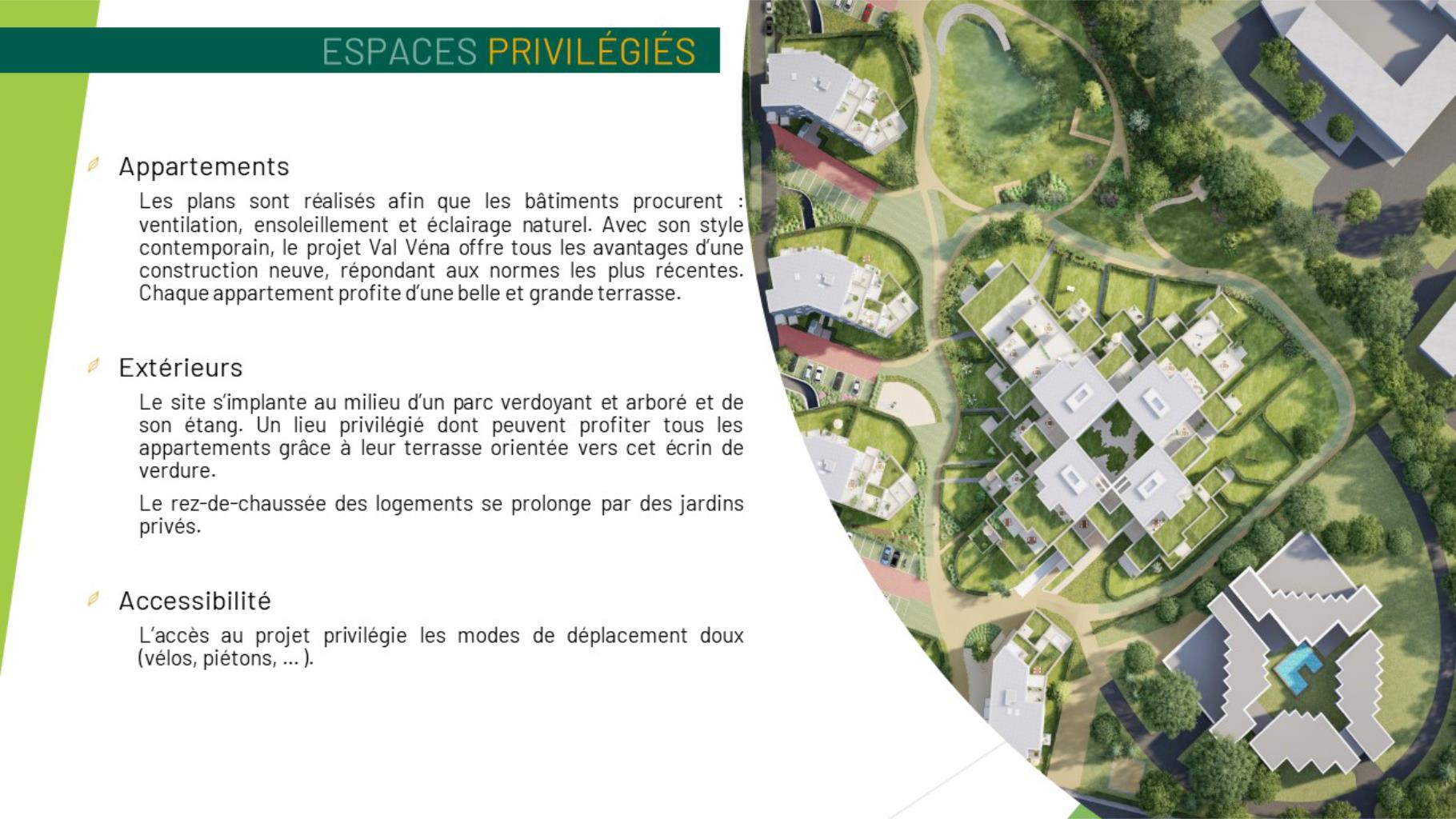 Né de la reconversion de l’ancien site Folon à Wavre, Val Véna offre un concept novateur en Brabant wallon permettant à de nombreuses personnes une facilité d’accès à la propriété en offrant des prix inférieurs au marché grâce au partenariat entre l’Agence de Promotion Immobilière du Brabant wallon (APIBW) et le promoteur du projet. Ce nouveau quartier est la combinaison parfaite entre les facilités qu’offrent la vie urbaine de Wavre et le calme d’un environnement verdoyant garantissant quiétude et bien être à ses habitants. Les appartements Val Véna (1ch au 3ch et penthouse) sont entourés d’écoles de qualité, de nombreux commerces, d’une gare ferroviaire, d’un centre sportif et culturel tout en préservant l’intimité et le confort. Les plans sont travaillés de manière à ce que les bâtiments procurent à chacun ; ventilation, ensoleillement et éclairage naturel. Avec son look contemporain, le Val Véna offre tous les avantages d’une construction neuve répondant aux normes les plus récentes. Chaque appartement profite d’une belle terrasse. Au programme, des finitions de qualités : parquets et carrelages de qualité dans toutes les pièces, cuisine et salle de bains équipées et buanderie , le tout dans un look modern et tendance. Le parc au centre de Val Véna incite à la balade et à la circulation douce (à vélo, à pieds, en transport en commun). Sa localisation rend également accessible des destinations telles que Bruxelles et Louvain-la-Neuve avec une facilité dû à sa proximité avec la gare, à la E411 et la N4.