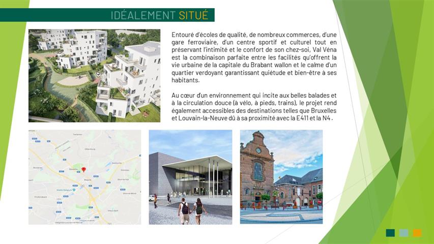 Né de la reconversion de l’ancien site Folon à Wavre, Val Véna offre un concept novateur en Brabant wallon permettant à de nombreuses personnes une facilité d’accès à la propriété en offrant des prix inférieurs au marché grâce au partenariat entre l’Agence de Promotion Immobilière du Brabant wallon (APIBW) et le promoteur du projet. Ce nouveau quartier est la combinaison parfaite entre les facilités qu’offrent la vie urbaine de Wavre et le calme d’un environnement verdoyant garantissant quiétude et bien être à ses habitants. Les appartements Val Véna (1ch au 3ch et penthouse) sont entourés d’écoles de qualité, de nombreux commerces, d’une gare ferroviaire, d’un centre sportif et culturel tout en préservant l’intimité et le confort. Les plans sont travaillés de manière à ce que les bâtiments procurent à chacun ; ventilation, ensoleillement et éclairage naturel. Avec son look contemporain, le Val Véna offre tous les avantages d’une construction neuve répondant aux normes les plus récentes. Chaque appartement profite d’une belle terrasse. Au programme, des finitions de qualités : parquets et carrelages de qualité dans toutes les pièces, cuisine et salle de bains équipées et buanderie , le tout dans un look modern et tendance. Le parc au centre de Val Véna incite à la balade et à la circulation douce (à vélo, à pieds, en transport en commun). Sa localisation rend également accessible des destinations telles que Bruxelles et Louvain-la-Neuve avec une facilité dû à sa proximité avec la gare, à la E411 et la N4.