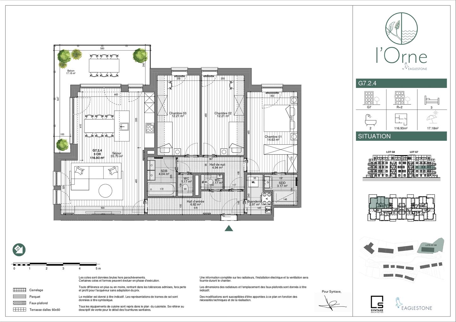 Appartement 3 chambres de 116,9 m² avec terrasse de 17,2 m² situé 2ième étage.