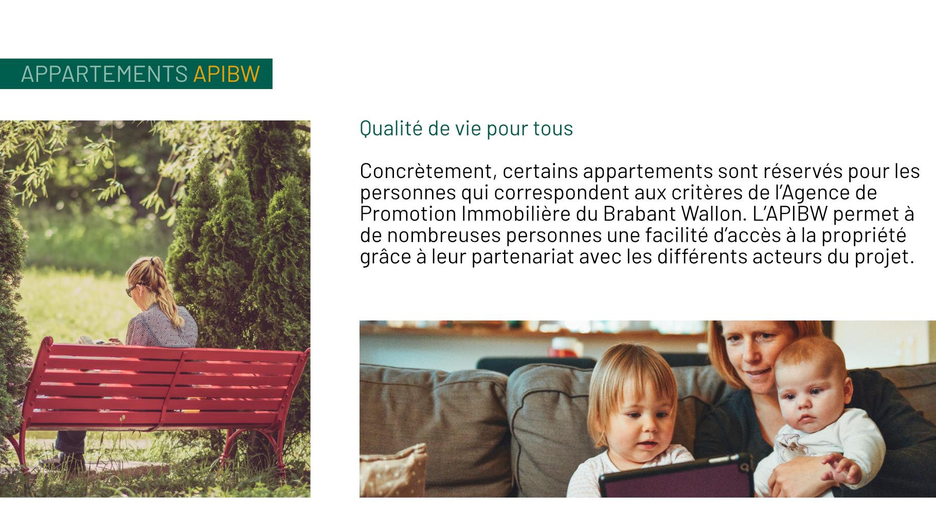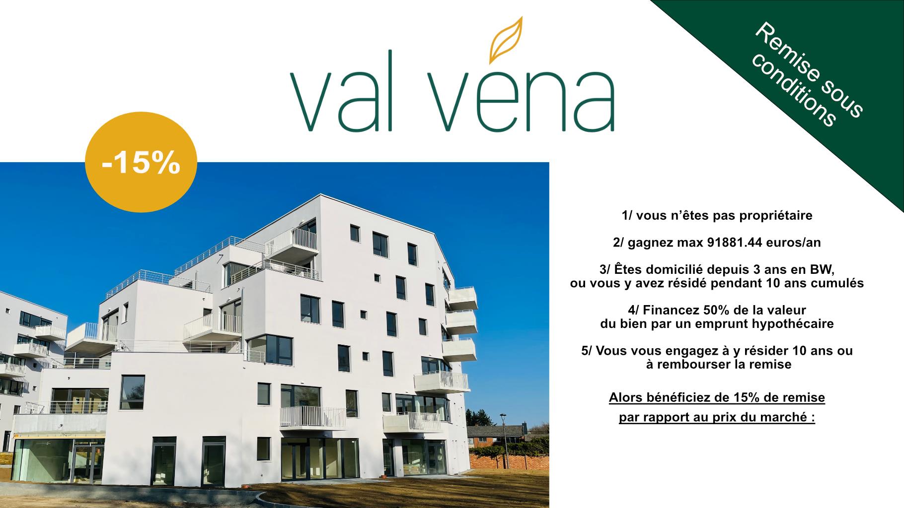 ENCORE quelques beaux appartements à vendre sous conditions - Né de la reconversion de l’ancien site Folon à Wavre, Val Véna offre un concept novateur en Brabant wallon permettant à de nombreuses personnes une facilité d’accès à la propriété en offrant des prix inférieurs au marché grâce au partenariat entre l’Agence de Promotion Immobilière du Brabant wallon (APIBW) et le promoteur du projet. Ce nouveau quartier est la combinaison parfaite entre les facilités qu’offrent la vie urbaine de Wavre et le calme d’un environnement verdoyant garantissant quiétude et bien être à ses habitants. Les logements Val Véna (1ch au 3ch et penthouse) sont entourés d’écoles de qualité, de nombreux commerces, d’une gare ferroviaire, d’un centre sportif et culturel tout en préservant l’intimité et le confort. Les plans sont travaillés de manière à ce que les bâtiments procurent à chacun ; ventilation, ensoleillement et éclairage naturel. Avec son style contemporain, Val Véna offre tous les avantages d’une construction neuve répondant aux normes les plus récentes. Chaque appartement profite d’une belle terrasse. Au programme, des finitions de qualités : parquet et carrelage de qualité dans toutes les pièces, cuisine et salle de bains équipées et buanderie , le tout dans un style moderne et tendance. Le parc au centre de Val Véna incite à la balade et à la circulation douce (à vélo, à pieds, en transport en commun).
