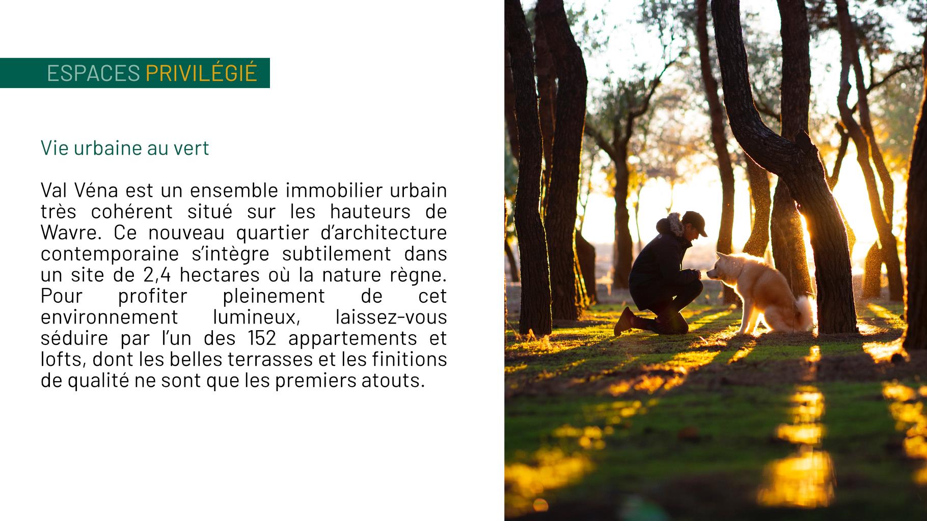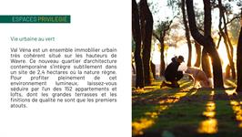 Val Véna est un ensemble immobilier urbain très cohérent situé sur les hauteurs de Wavre. Ce nouveau quartier d’architecture contemporaine s’intègre subtilement dans un site de 2,4 hectares où la nature règne. Pour profiter pleinement de cet environnement lumineux, laissez-vous séduire par l’un des 152 appartements et lofts, dont les belles terrasses et les finitions de qualité ne sont que les premiers atouts.