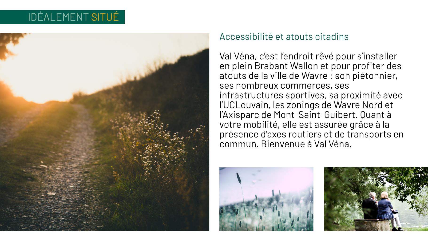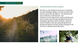 Val Véna, c’est l’endroit rêvé pour s’installer en plein Brabant wallon et pour profiter des atouts de la ville de Wavre : son piétonnier, ses nombreux commerces, ses infrastructures sportives, sa proximité avec l’UCLouvain, les zonings de Wavre Nord et l’Axisparc de Mont-Saint-Guibert. Quant à votre mobilité, elle est assurée grâce à la présence d’axes routiers et de transports en commun. Bienvenue à Val Véna.