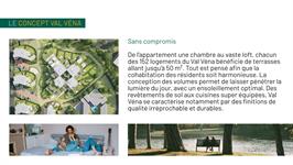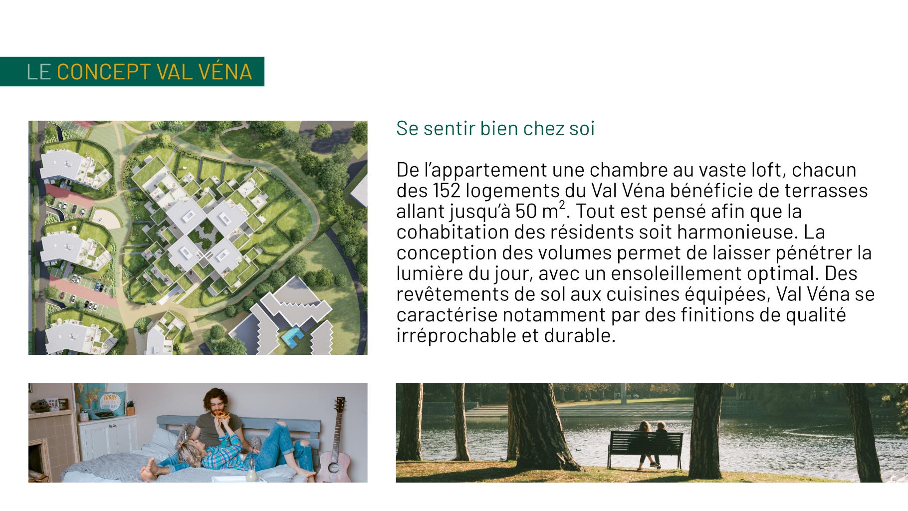 De l’appartement une chambre au vaste loft, chacun des 152 logements du Val Véna bénéficie de terrasses allant jusqu’à 50 m². Tout est pensé afin que la cohabitation des résidents soit harmonieuse. La conception des volumes permet de laisser pénétrer la lumière du jour, avec un ensoleillement optimal. Des revêtements de sol aux cuisines super équipées, Val Véna se caractérise notamment par des finitions de qualité irréprochable et durables.