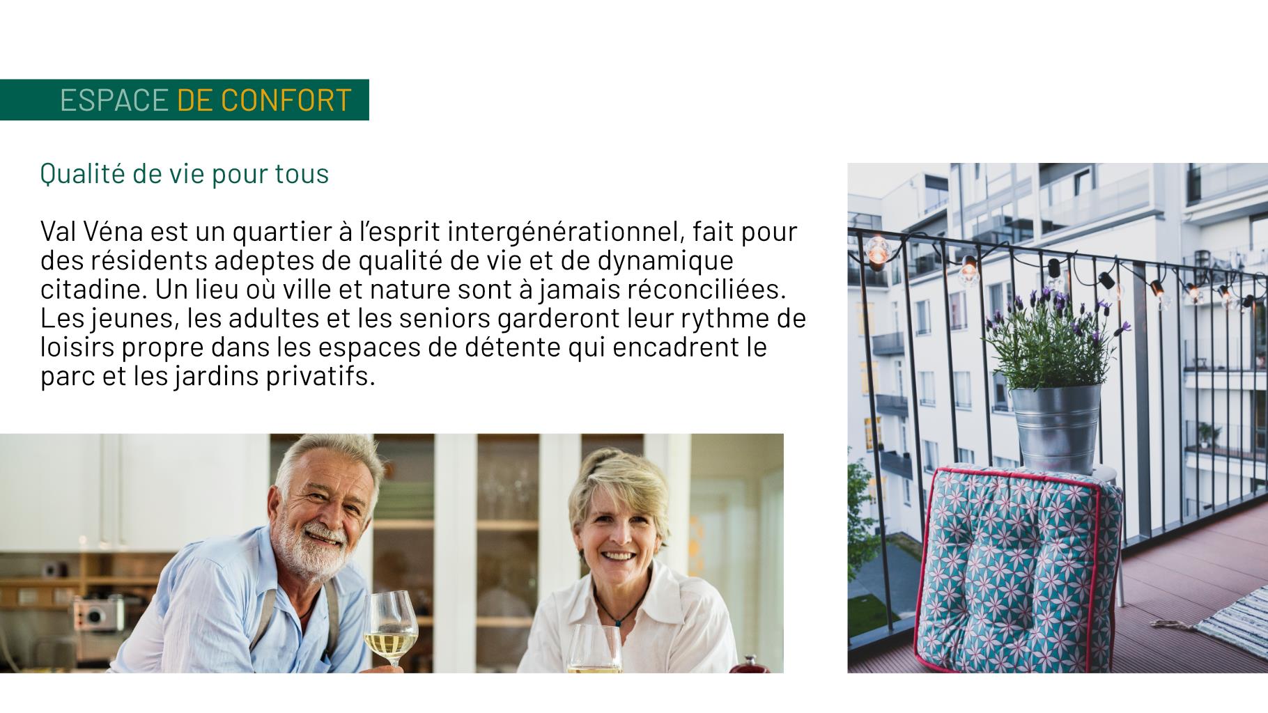Val Véna est un quartier à l’esprit intergénérationnel, fait pour des résidents adeptes de qualité de vie et de dynamique citadine. Un lieu où ville et nature sont à jamais réconciliées. Les jeunes, les adultes et les seniors garderont leur rythme de loisirs propre dans les espaces de détente qui encadrent le parc et les jardins privatifs.