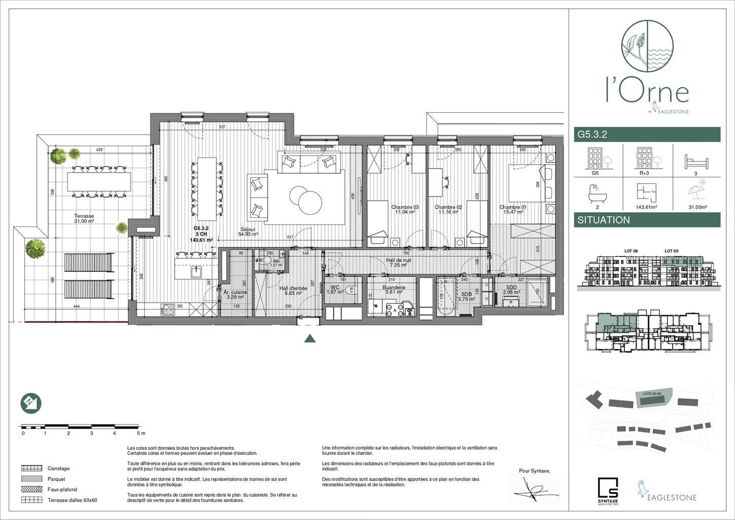 Penthouse 3ch de 143,30m² avec terrasse de 32,60m² situé au 3ième et dernier étage.